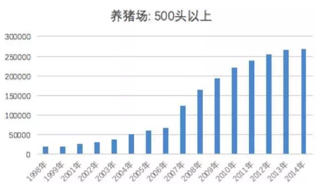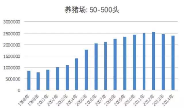第一阶段是 1980 年代,大约持续 10 年,养猪场数量从 70 万变成 30 万,100 头年出栏量以下的养猪场退出市场。他们倒闭的原因很简单,80 年代美国进入一轮猪周期的下行趋势,导致了一波倒闭;政府当时又补了 “一刀”,之前政府对养猪场的补贴和养猪场的规模大小没关联。而在猪肉下行阶段时,政府只补贴大型养猪场,忽略小规模的。