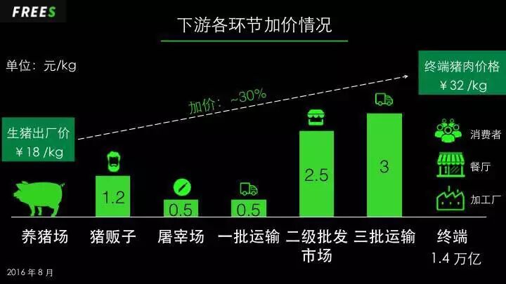 与蔬菜水果(200-300% 的加价)相比,整个猪肉的流通环节相对高效,相对有改进空间的是次终端。 在未来的 5-10 年内,随着规模化的推进,中国的猪肉价格波动,会大幅下降。 猪肉制品里,符合消费升级趋势的新品类是有机会的。